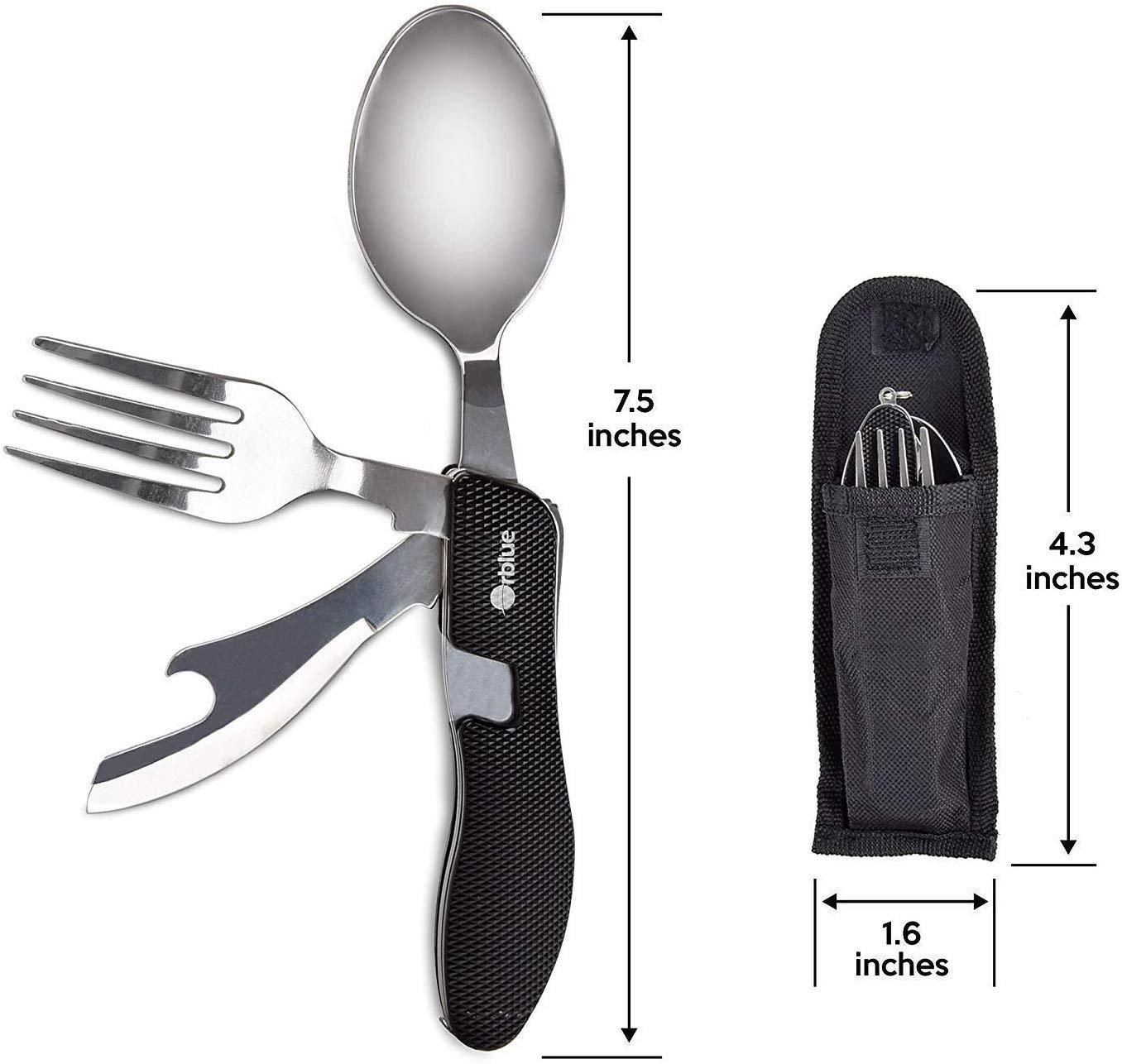 - 4-In-1 CAMPING CUTLERY. Set includes camping spoon , fork, knife and bottle opener. Travel utensil stays together when not in use. And the removable camping fork can be held in one hand, with spoon knife in the other. Convenient lunchbox utensils that you can bring to work or school.